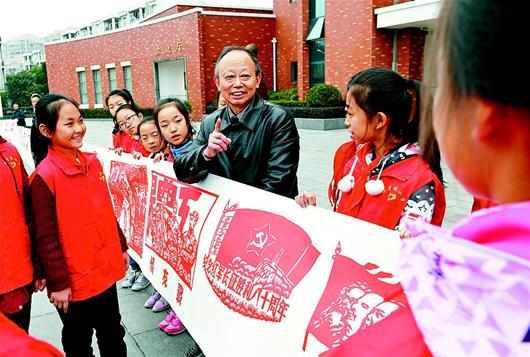 昨日(11月1日),宜都总工会退休干部艾道新在杨守敬小学向学生展示他的剪纸作品《长征组图》。为纪念中国工农红军长征胜利80周年,艾道新历时3个月,创作了95幅剪纸作品,组成长达56米的历史画卷,并在广场、学校、机关等地展出,受到群众欢迎。
