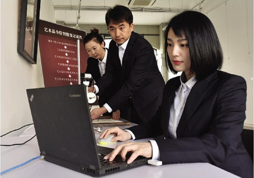 图为华中文交所工作人员利用自主研发的“艺术品身份智能鉴定系统”,为艺术品办“身份证”。