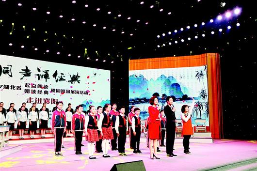 昨日(21日),“同声诵经典――2017湖北省‘起点阅读・朝读经典’校园巡回展演活动”走进襄阳。襄阳人民路小学、前进路小学、荆州街小学、33中、41中等9个县市区的近400名学生代表,和社会各界热爱诗词的人士齐聚襄阳广播电视台演播厅,共诵国学经典。